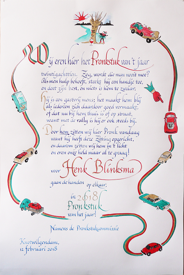 Huwelijksakte voor de themabruiloft (Gouden Gala) en oorkonde voor het Pronkstuk van 2018 in Knotwilgendam (Vlijmen); het thema van het jaar 2018 was “Ut dak eraaf!”