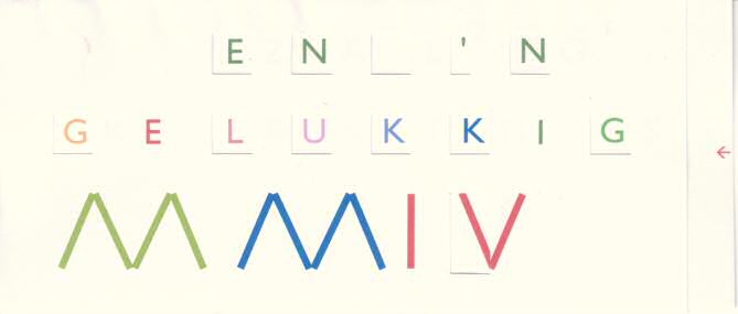 Het kaartje bestaat uit twee delen: een hoes met gaatjes, en een vel dat daarin heen en weer kan schuiven.