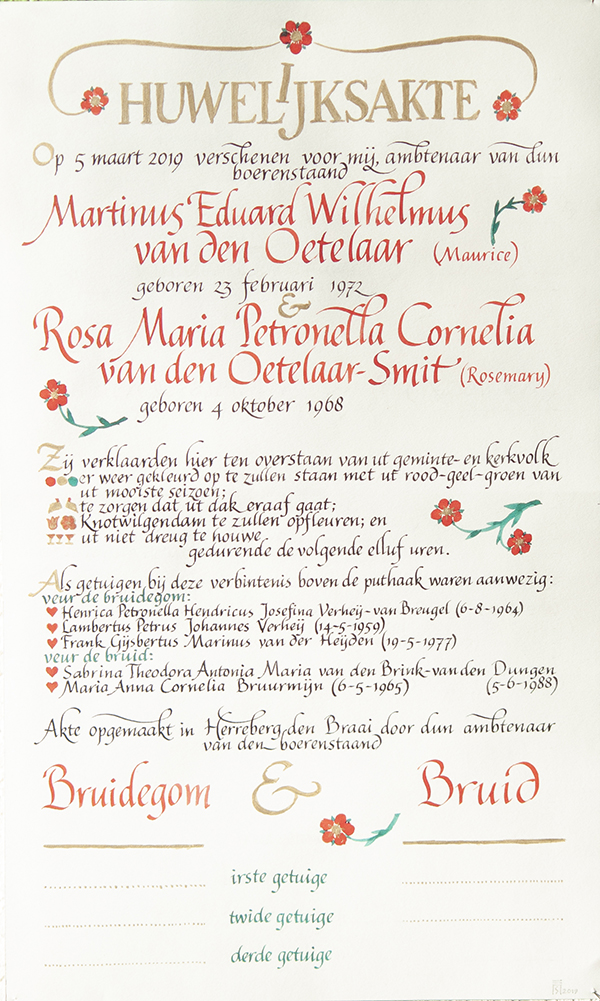 Huwelijksakte voor de themabruiloft (Gouden Gala) en oorkonde voor het Pronkstuk van 2019 in Knotwilgendam (Vlijmen); het thema van het jaar 2019 was “Knotwilgendam det fleurt oe op!”